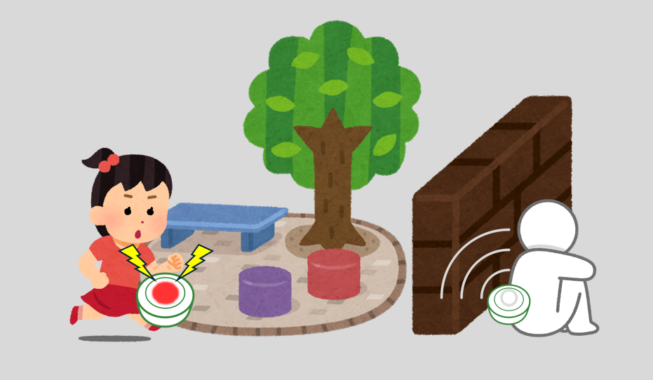 そうしておいて、例えば隠れている子から半径20mの範囲に入ったら鬼の子が持っているBLEAD-SLが鳴るという設定にしておけば、具体的な場所は分からないものの「近くにいるぞ!」ということが分かりワクワク感やドキドキ感が普通の鬼ごっこより高まります。(もちろん鉄製の壁など電波を減衰させる素材の近くにいると検出距離は短くなってしまいますが)